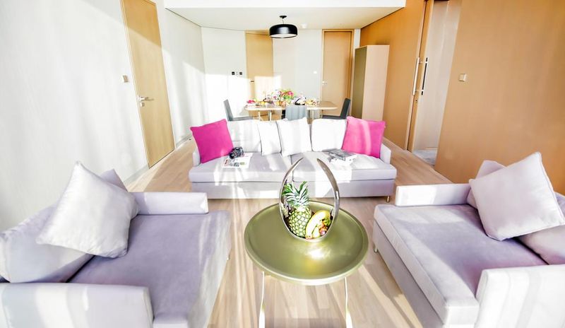 Хорошо обставленные суперлюксы с 1 спальней отличаются более просторной планировкой и повышенной комфортабельностью. Стильная мебель в сочетании с насыщенными спокойными оттенками интерьера создают в номере домашнюю, уютную обстановку. Из окон открывается восхитительный вид на кристально чистые воды Персидского залива или городской пейзаж. В распоряжении гостей большая гостиная зона с обеденным столом, кофемашиной Espresso и телевизионной приставкой Apple TV.