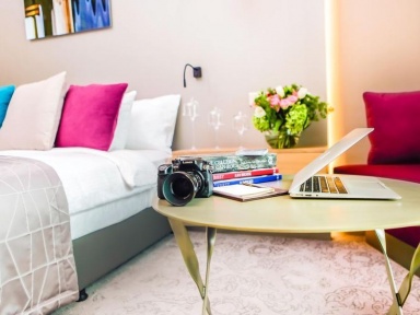 Этот суперлюкс с 2 спальнями отличается изысканными архитектурными решениями и деталями интерьера. В распоряжении гостей большая гостиная зона с телевизионной приставкой Apple TV и полностью оборудованная мини-кухня с микроволновой печью, холодильником, индукционной плитой и кофемашиной Espresso.